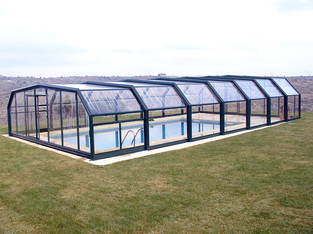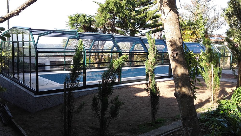 Os lados oblíquos estão presentes nesta cobertura de piscina de 5 ângulos. Começando com 2,00m de altura no primeiro elemento, com larguras que variam de 3,80m a 13,00m, adaptando-se ao tipo de perfil principal P10, P15 e P200 à largura desejada ou necessária.